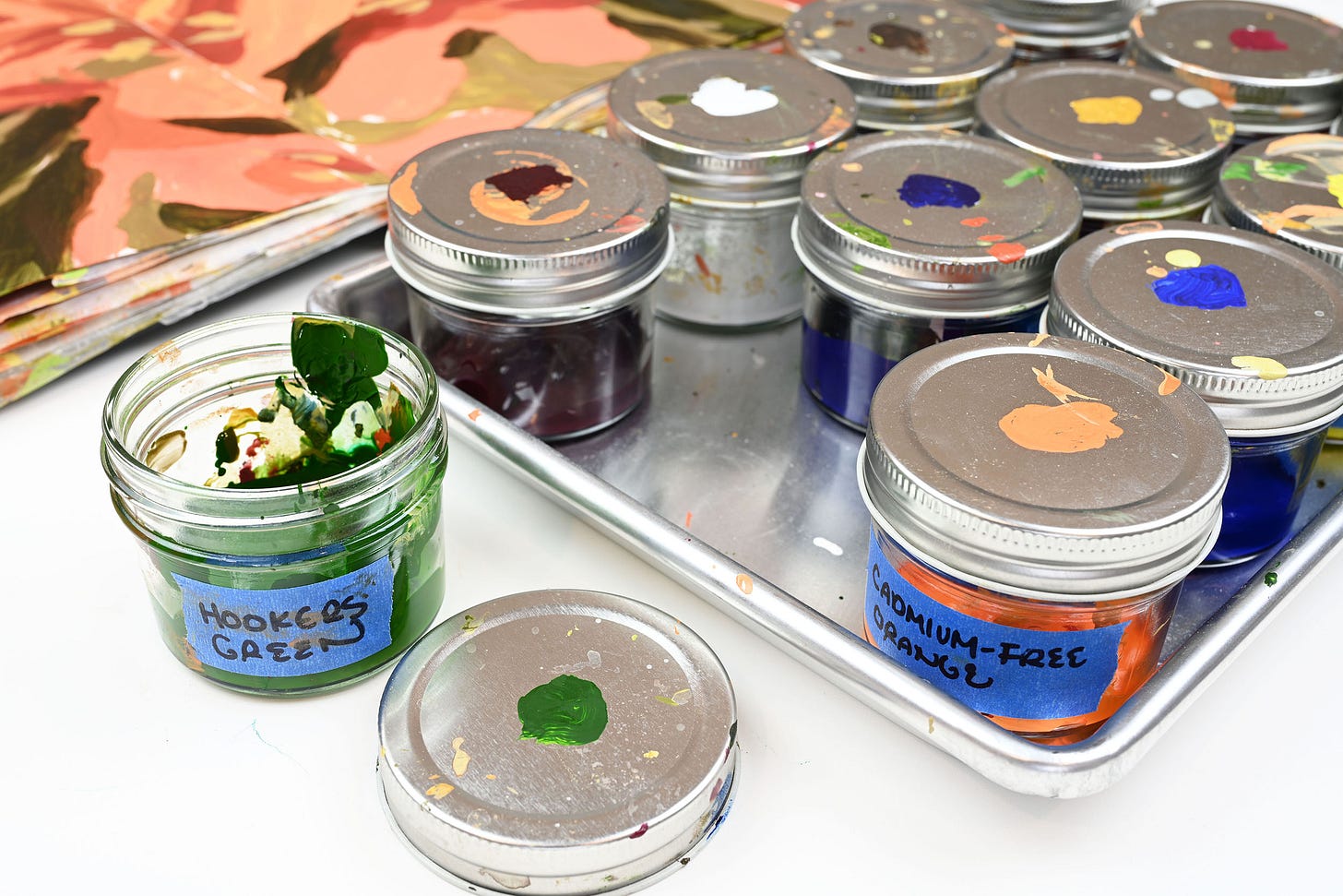 I keep my jars of paint on a rolling cart next to my easel. To help keep these little containers from sliding around and falling off the cart (I’m clumsy like that), I set them on a half baking sheet. I can fit 12 on the sheet.